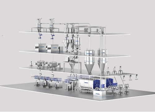 我們從解包投料、儲(chǔ)存破拱、氣力輸送、計(jì)量配料到混合攪拌的整個(gè)工藝流程,全方位多角度考慮生產(chǎn)的潔凈、便利與安全,為客戶提供一整套食品級(jí)原料處理一站式解決方案。